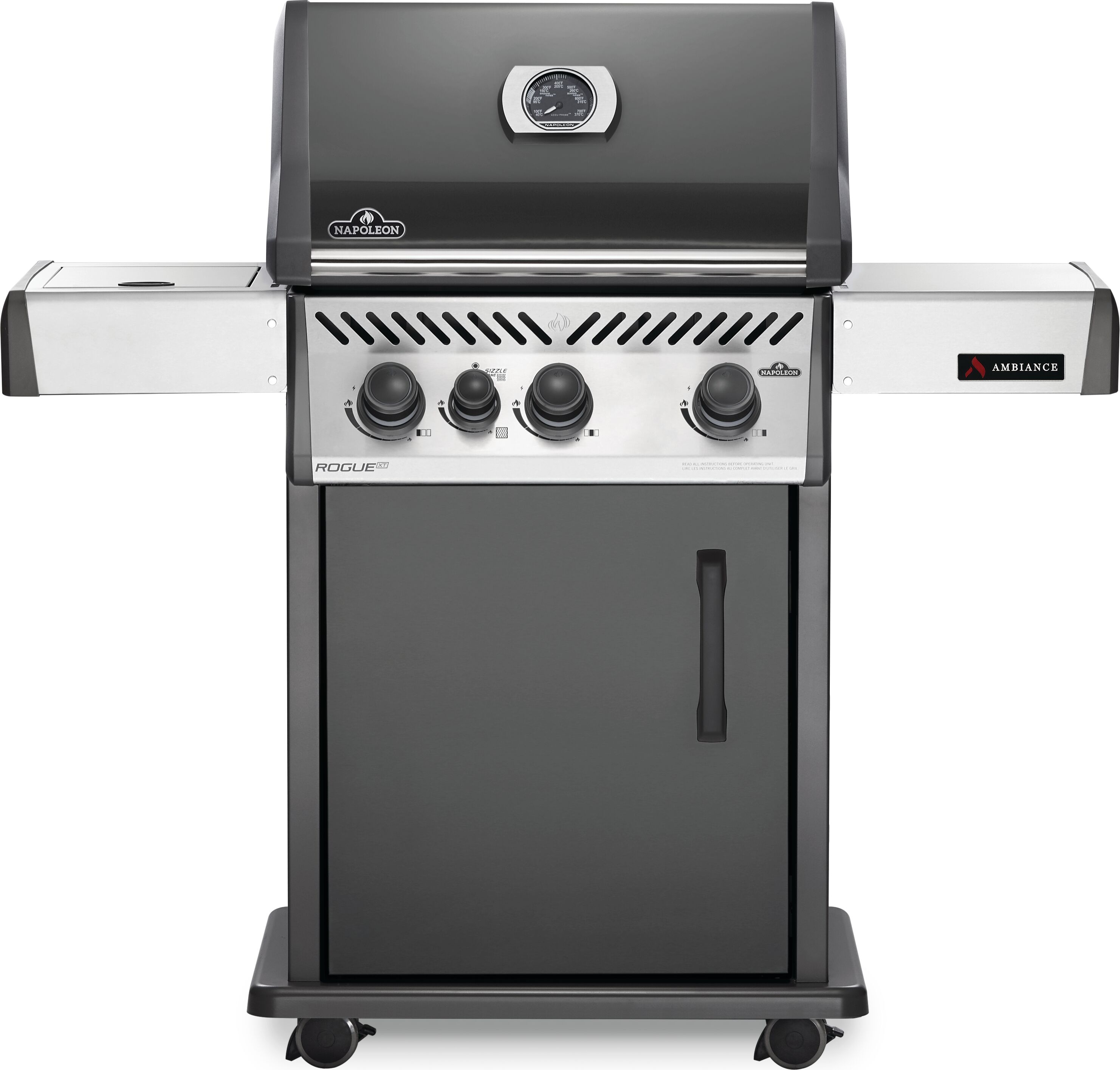 The Napoleon Rogue® XT 425 Propane Gas Grill with Infrared Side Burner, features a stylish Charcoal finish. This grill is durable. Featuring three main burners and a high top lid, this grill has everything you need to create gourmet meals. Sear restaurant-style steaks on the integrated sear station, while generous, folding side shelves provide plenty of prep space.